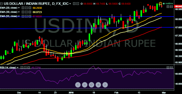 We prefer to take short position in USD/INR above 68.70, stop loss 68.92 and target 68.48 levels.