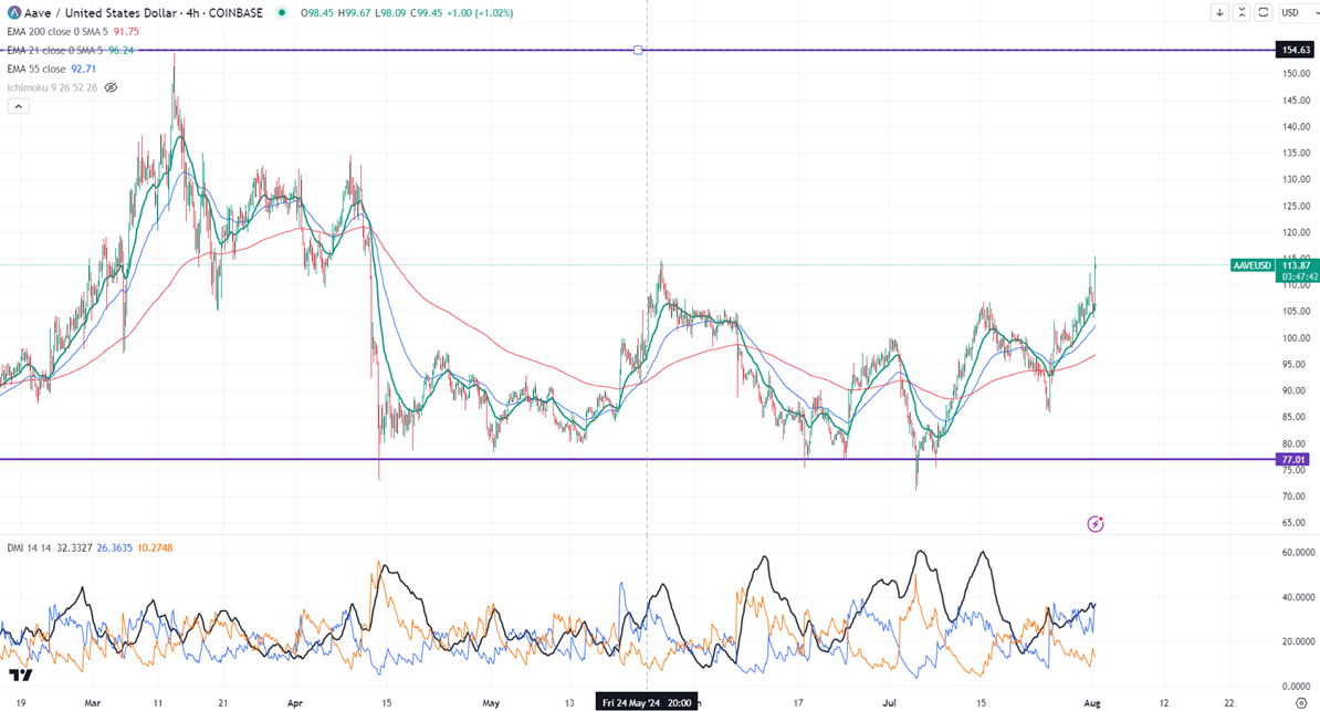 AAVEUSD was the best performer for the past two days and surged more than 30%. The pair holds well above the short-term (21 and 55 EMA) and long-term moving average. It hit a high of $115.45 and is currently trading around $113.63.