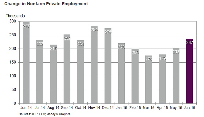 - Non-farm private sector employment grew at 237,000 in June, highest since December last year. In May payroll grew by 203,000.