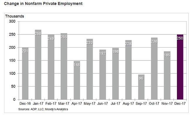 - Non-farm private sector employment grew at 250,000 in December. In November payroll grew by 190,000.