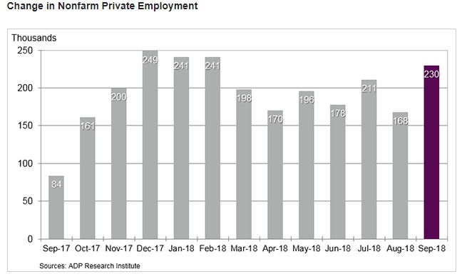 - Non-farm private sector employment grew at 230,000 in September. In August payroll grew by 163,000.
