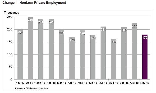 - Non-farm private sector employment grew at 179,000 in November. In October payroll grew by 225,000.