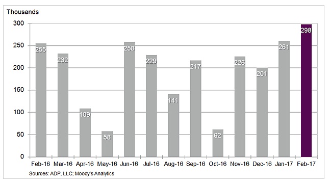 - Non-farm private sector employment grew at 298,000 in February. In January payroll grew by 246,000.
