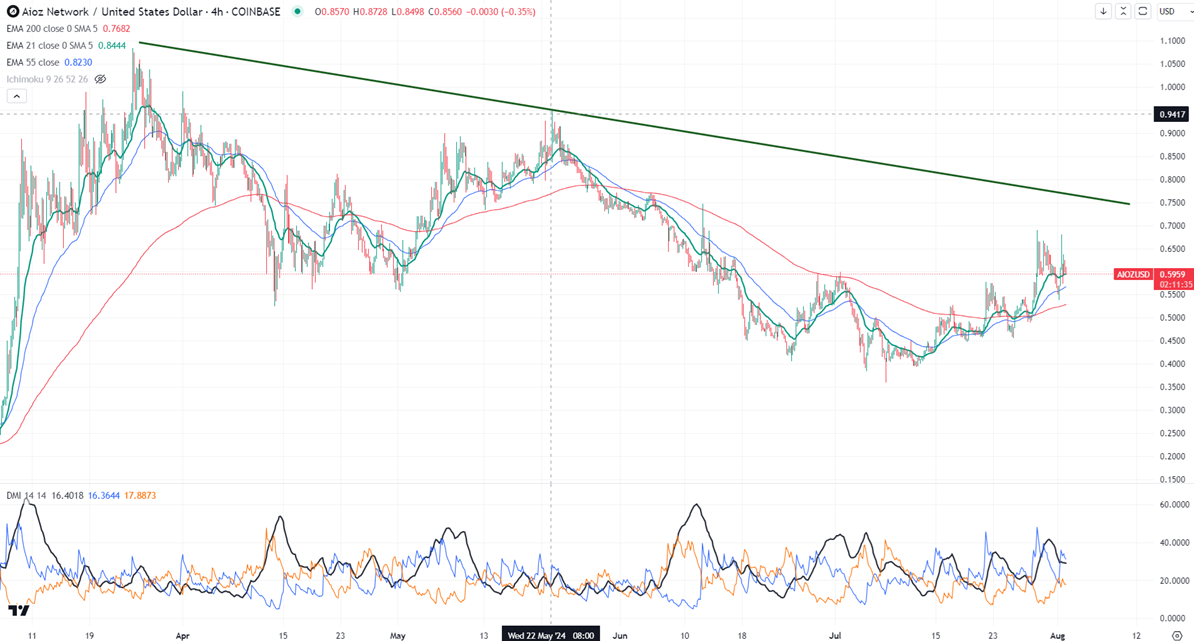 AIOZUSD is consolidating after forming a minor top $0.6896.The pair holds above the short-term (21 and 55 EMA) and long-term moving average in the 4-hour chart. It hit a low of $0.5395 and is currently trading around $0.6027.