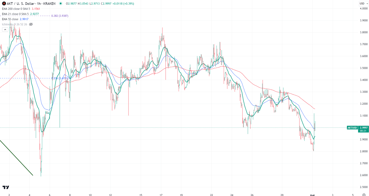 AKTUSD gained more than 10% today after a massive sell-off. The pair holds above the short-term (21 and 55 EMA) and below long-term moving average in the hourly chart. It hit a high of $3.125 and is currently trading around $2.99.