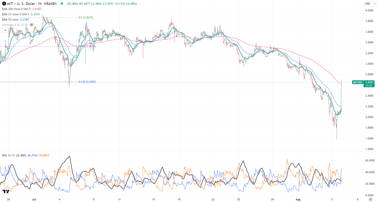 AKTUSD gained more than 65% today after a massive sell-off. The pair holds above the short-term (21 and 55 EMA) and below the long-term moving average in the hourly chart. It hit a high of $2.65 and is currently trading around $2.6648.