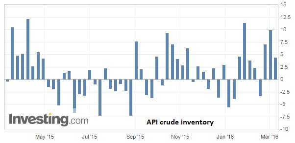 - American Petroleum Institute's (API) weekly report showed inventory rose by 4.4 million barrels. Most of it is largely due to