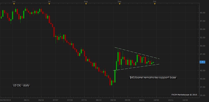 Crude oil (WTI) is finding support around $43/barrel critical support area, however struggling to break above $48/barrel interim resistance.