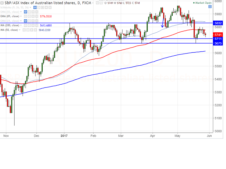 - ASX200 has formed a triple bottom around 5675 and any break below will drag the index down till 5615 (200 day MA)/5579 (Feb 7th 2017) is possible.