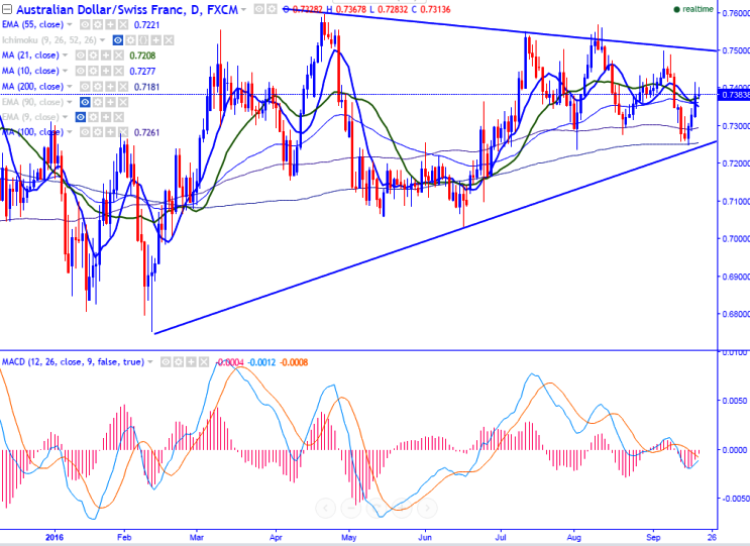 - AUD/CHF is trading slightly above 21- day MA and a jump till 0.7440 (61.8% retracement of 0.7570 and 0.72470)/0.75005 (Sep 6th 2016 high)/0.7570.