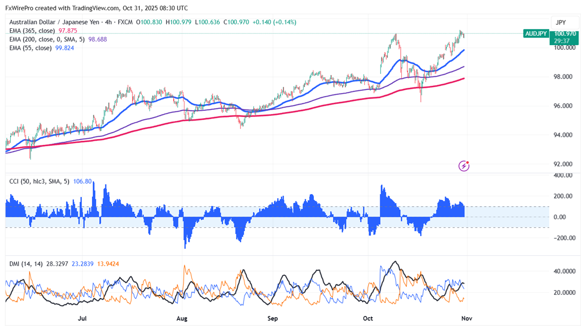 AUDJPY showed a minor profit booking as the yen recovers. It hits an intraday high of 101.20 and is currently trading around 100.74. Intraday trend remains bullish as long as support 99.40 holds.