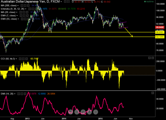 AUD/JPY is trading near major trend line support 89.50 (trend line joining 89.15 and 89.33) and any break below will drag the pair further down till 86.40/84.
