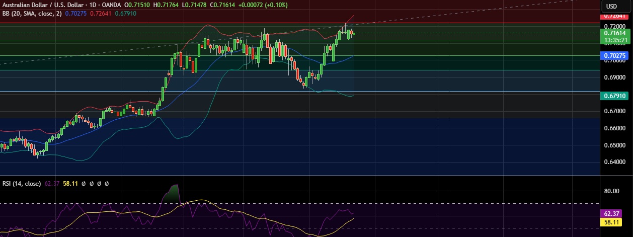 • Immediate resistance is located at 0.7224(23.6%fib), any close above will push the pair towards 0.7260(Higher BB).