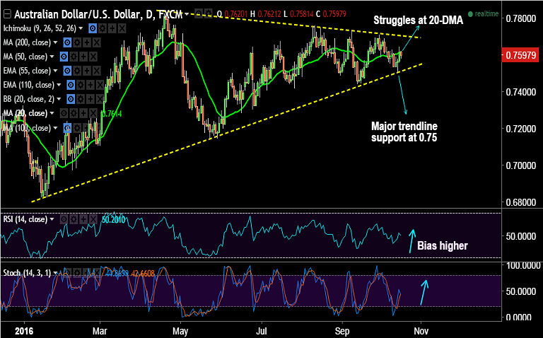 - On the flipside, decisive break above 20-DMA at 0.7614 could see gains upto 0.77 (trendline resistance).