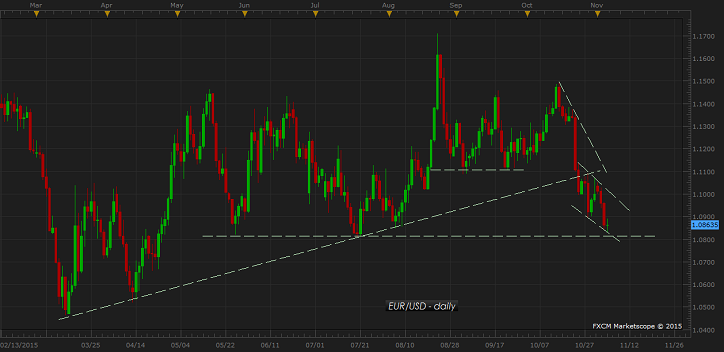 Though Euro/Dollar exchange rate is more likely to slide down thanks to greater expectation of further action from European Central Bank (ECB). However if the current falling channel holds, with weaker than expected non-farm pay roll data could led to the test of channel resistance which will lead the pair to move another 80-90 points higher from current 1.087.