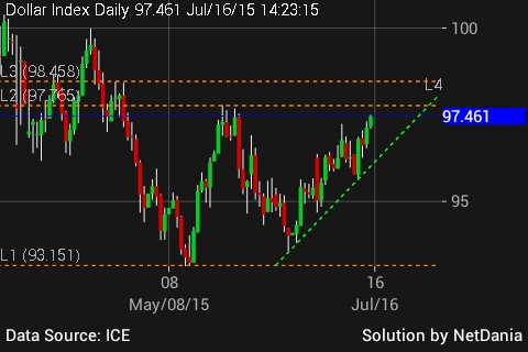 Dollar is likely to remain strong and wait for further commnications from FED at July meeting. Dollar index is currently trading at 97.4, up 0.3% for the day.