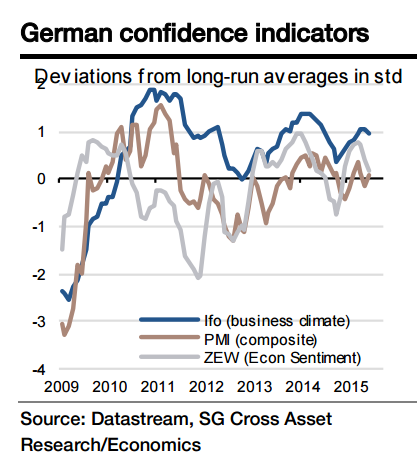 Growth estimates based on the Ifo thus continues to signal relatively high growth in Q2 and Q3. As in other surveys, we expect only a small decline in expectations while current conditions should continue to adjust down