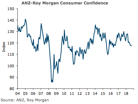 Australia’s ANZ-Roy Morgan consumer confidence index, which was unchanged in September at 118, close to the historical average. The current conditions index fell 4 points to 120, while the future conditions index lifted 2 points to 116.