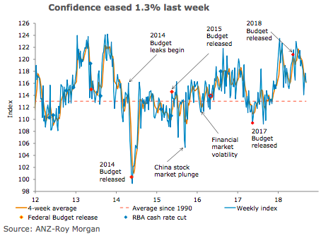 Australia’s ANZ-Roy Morgan consumer confidence eased 1.3 percent last week, after two straight weekly rises. Improvements in sentiment toward future finances and current economic conditions were not strong enough to offset falls in the remaining sub-indices.