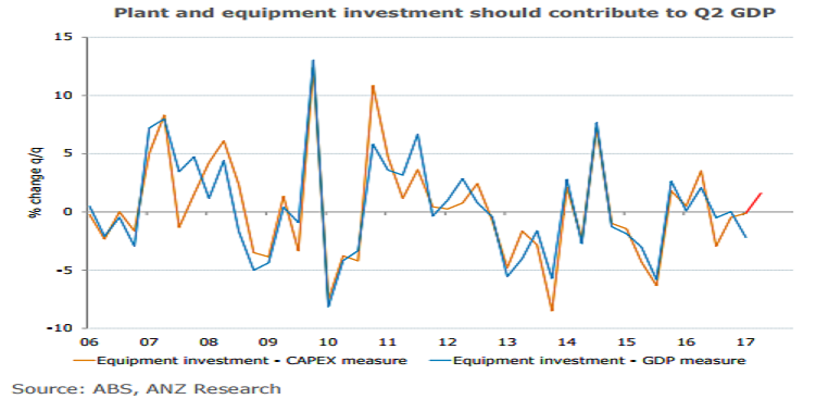Aside from this temporary factor, the most important part of the Q2 result is spending on plant and equipment investment as it will flow directly into the Q2 GDP result. P&E investment likely rose by 1.6 percent q/q, in line with solid capital goods imports in the quarter.