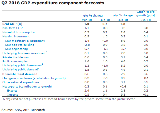 Australia’s gross domestic product (GDP) for the second quarter of this year is expected to have risen a solid 0.7 percent q/q, following a rise of 1.0 percent in Q1. This would see annual growth edge down to 2.8 percent, although annualised H1 growth would be a strong 3.5 percent, according to the latest report from ANZ Research.