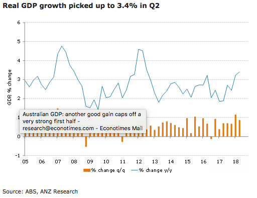Australia’s gross domestic product (GDP) for the second quarter of this year rose 0.9 percent q/q and 3.4 percent y/y in Q2, much stronger than expectations, capping off a very strong first half where annualised growth was a robust 4.1 percent. The strength was concentrated in housing construction, mining investment and public consumption, while household spending rose a moderate 0.7 percent q/q.