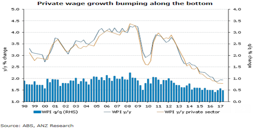 Australia’s Wages rose in line with expectations in Q2, although private wage growth remains particularly weak, with no signs of a pick-up. The wage price index (WPI) rose by 0.5 percent q/q in Q2 and is up 1.9 percent over the year. While this was in line with market expectations, private wage growth decelerated from 0.5 percent q/q in Q1 to 0.4 percent q/q. Meanwhile, public sector wages rose by 0.6 percent, leaving the annual pace of public sector growth stable at 2.4 percent y/y.