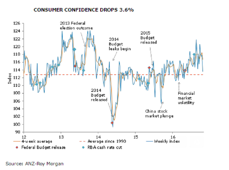 The ANZ-Roy Morgan Australian consumer confidence plunged 3.6 percent, helped by views towards finances over the next 12 months which dropped 7.1 percent, bringing the index down to its lowest level since September last year.