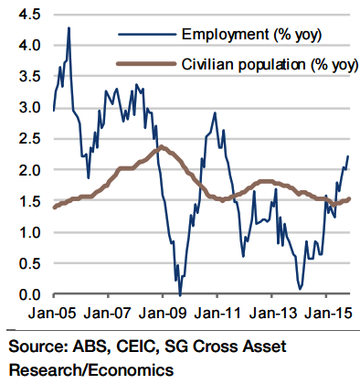 "Broadly speaking, employment conditions are likely to have remained solid at the start of Q4, given the continuing rebalancing of growth away from resource investment towards the more labour-intensive sectors of residential construction and services exports" says Societe Generale in a research note.