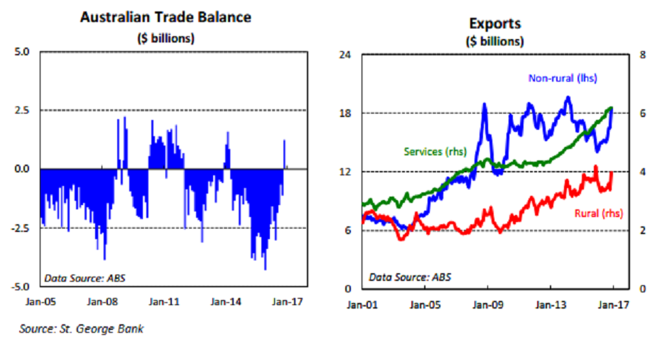 Rural exports posted the biggest monthly gain since December 1995 and non-rural exports the largest since April 2010. A recovery in commodity prices through 2016, especially for the bulk commodities, is feeding through to export receipts.