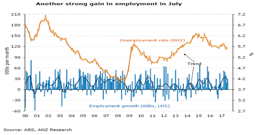 Australia posted another strong labour market report for Australia in July, showing employment up 28k and unemployment at 5.6 percent. Some of the detail was a bit softer than the headline; full-time jobs fell, hours worked were down and the jobs gains were narrowly based.