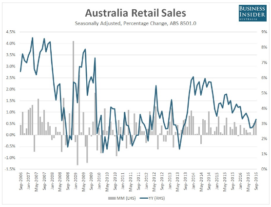 The ABS revised August retail sales growth higher to 0.5 percent from 0.4 percent previously reported. In a signal of ongoing strength in the home-renovation market, sales of household goods rose by 2.3 percent in September from August. That was the highest increase in more than a year and more than four times the growth in the previous month.