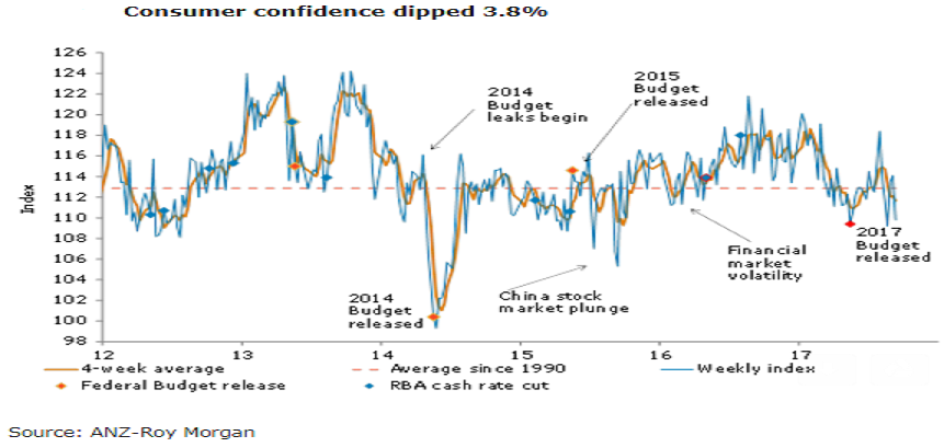 Australia’s weekly consumer confidence witnessed a sharp fall last week, largely offsetting the gains over the previous two weeks, widely due to a sizeable decline in households’ perceptions of the economic outlook driving the deterioration in sentiment.