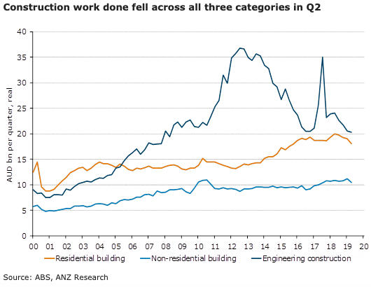 Australia’s construction work done fell for a fourth consecutive quarter in Q2. The contraction in residential activity accelerated, non-residential building activity dropped across both private and public sectors, and the weakness in engineering construction persisted, with only a small uptick in public sector work done, according to the latest report from ANZ Research.