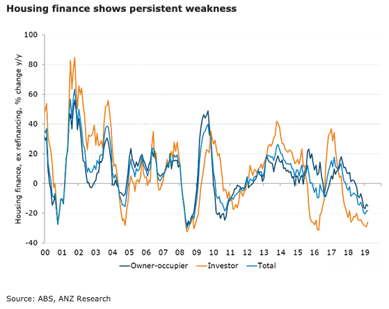 Meanwhile, investor finance is still falling quickly. The annual loss in investor finance has been at least 20 percent each month since February 2018. However, the annual result was the smallest decline in 2019 so far.