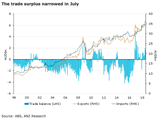 Australian trade surplus narrowed during the month of July, weighed down by fall in export values of metal ores and minerals. There were also signs that the East Coast drought may be weighing on exports, according to the latest report from ANZ Research.