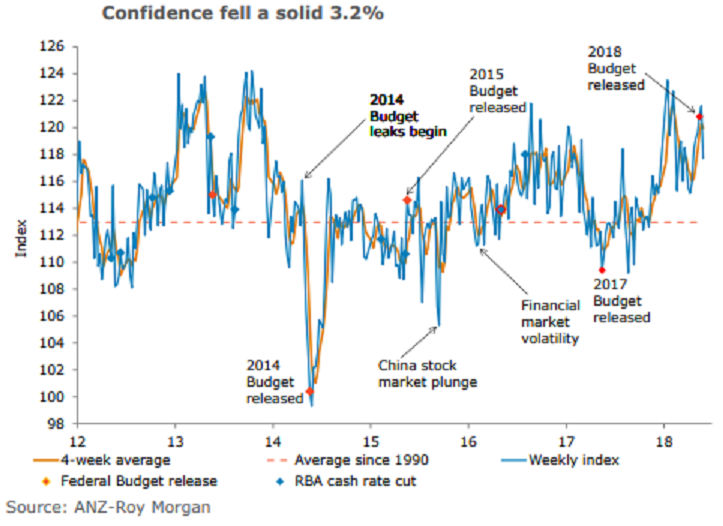 Australia’s ANZ-Roy Morgan consumer confidence dropped 3.2 percent last week to 117.7, after six straight weekly gains. The details were also negative with confidence falling across all sub-indices, led by a sharp fall in views towards future financial conditions.