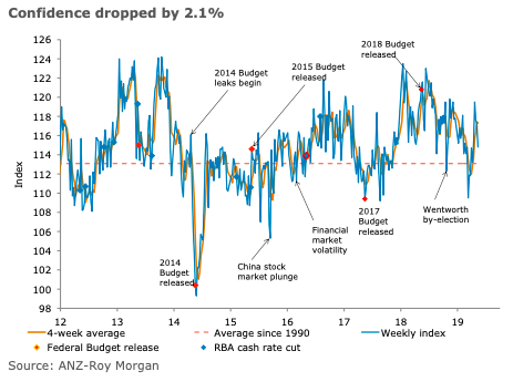 "The fall in consumer sentiment follows a couple of important developments. Domestically the RBA decided to leave interest rates unchanged after considerable speculation that a rate cut might occur. Globally, the US-China trade dispute resumed with the US increasing tariffs on a wide range of goods. At this stage, consumers see these events as more damaging for overall economic prospects than their own finances. After a period of weakness, inflation expectations jumped to 4.5 percent for the week, pushing the four week moving average to 4.2 percent – its highest level since the end of January. The uptrend in petrol prices over the last few weeks may have supported inflation expectations," said David Plank, ANZ’s Head of Australian Economics.