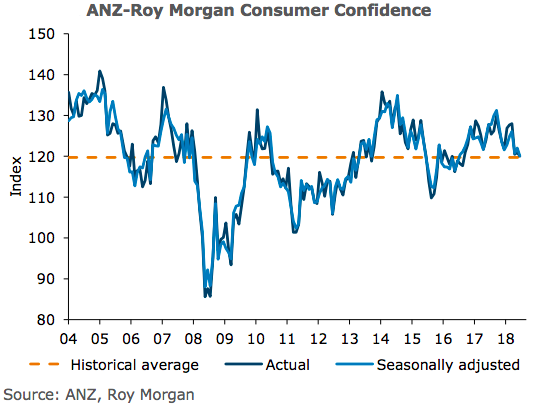 Australia’s ANZ-Roy Morgan consumer confidence Index, slipped 1 point to 120 in June, its lowest level since August 2016. On a seasonally adjusted basis the index fell 2 points, also at 120. Current conditions remain upbeat, but households are wary about the outlook.