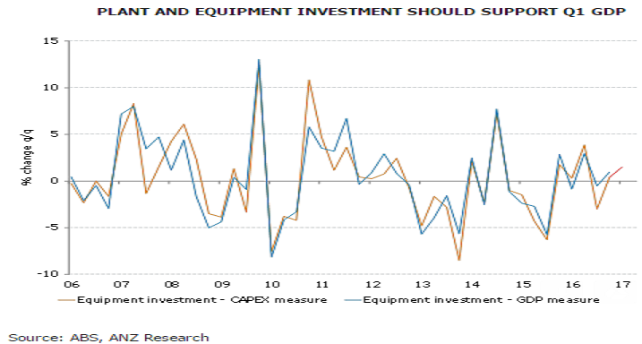 The most important part of the Q1 result is the investment in plant and equipment (P&E), which flows directly into GDP and it is expected to rise 1.5 percent q/q, given solid capital goods imports in the quarter. This is likely to be one of the few positive notes in next week’s GDP report, where the Q1 growth of is seen at just 0.1 percent q/q, ANZ Research reported.
