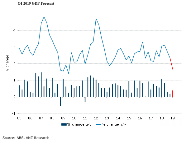Australia’s gross domestic product (GDP) for the first quarter of this year is expected to post another disappointing rise in GDP of 0.4 percent q/q, according to the latest report from ANZ Research. This would see annual growth decline to 1.7 percent - its slowest pace since 2009 in the midst of the global financial crisis.