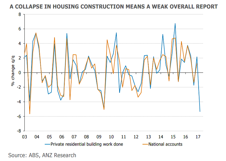 Construction is a building block of GDP data which will be released next week. The Q1 construction result which is clearly weak, dented by the drop in housing, suggests drag on first quarter GDP. A slowdown in consumer demand, the impact of cyclone Debbie and a slowdown in home building activity, especially apartments, have some economists worried that the economy might have slowed sharply in Q1.