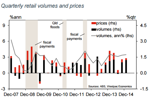 More generally, the retail survey is a problematic guide to total consumer spending. The RBA was badly wrong-footed by the retail strength in 2014 H2. That said, the softer Q2 retail read is expected to be more in line with the broader national accounts measures this time around, even understating conditions slightly.