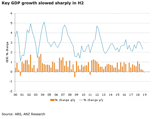 Australia’s gross domestic product (GDP) for the last quarter of 2018 slowed to 0.2 percent q/q and 2.3 percent y/y. Looking at Q3 and Q4 together shows that annualised growth in the second half was 0.9 percent, a sharp step down from 3.8 percent in H1, with a notable softening in the household sector.