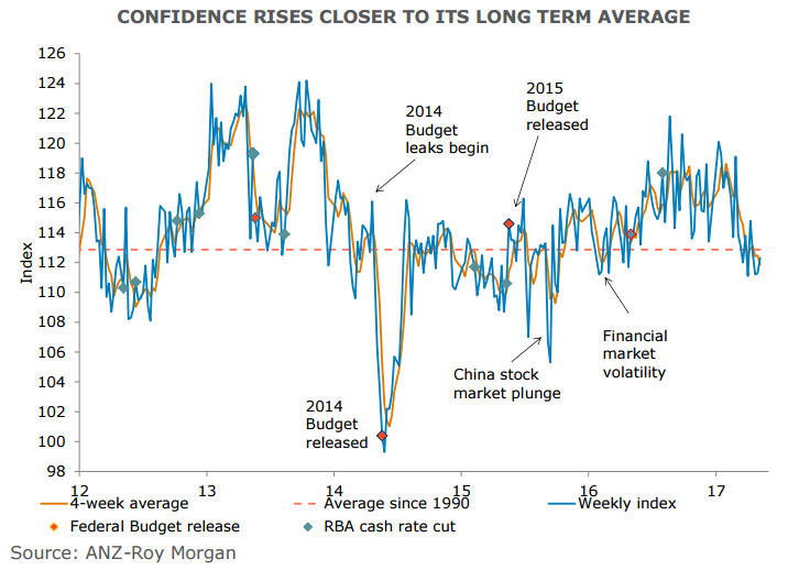 Australia's consumer confidence ticked up a modest 0.9 percent in the week ending 7 May, data released earlier today showed. The index edged higher to 112.3 – just below its long term average. Households’ near and long term economic outlook posted solid increases of 5.0 percent and 4.9 percent respectively.