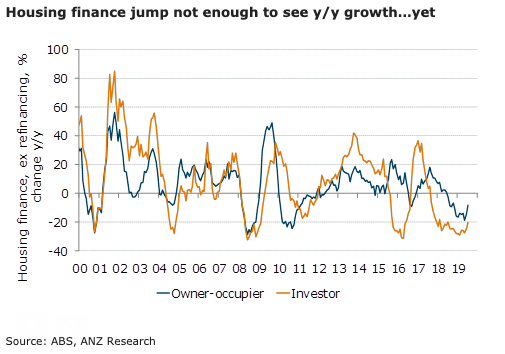 Owner-occupier lending grew 5.3 percent m/m in July ex refinancing, the highest result since August 2015. Annual growth is still negative (-8.3 percent y/y), but it is the smallest negative result since October 2018.