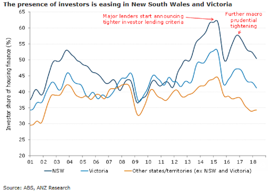 The share of borrowing by investors continues to fall, and at 42 percent is the lowest since 2012. New South Wales and Victoria have seen the sharpest declines, consistent with the rapid cooling in their respective housing markets in recent months.