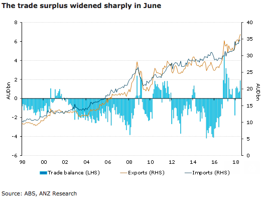 Australia’s trade surplus for the month of June beat market expectations, even after a slight downward revision to May’s surplus. Despite the strength in export values in the month of June it looks like net exports are set to have made no contribution to GDP growth in Q2, according to the latest report from ANZ Research.