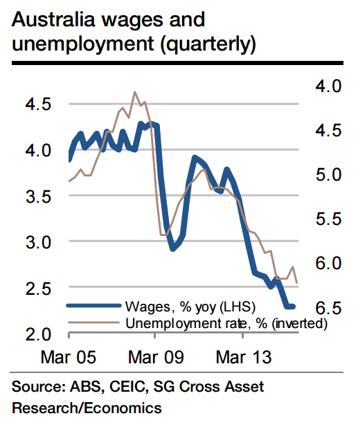 As unemployment in Australia started to rise in late 2012, wage growth slowed. By the start of this year, annual wage growth (excluding bonuses) had declined to 2.3%, the lowest in the series' - admittedly fairly short - history (it started in mid-1997). With unemployment now at least having peaked, and households' improved perceptions about the state of the labour market, wage growth is expected to also bottom out and start to recover into 2016.
