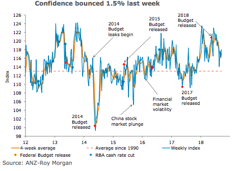 "Overall, while confidence has fallen from its high in June, it remains well above average levels and, in four-week moving average terms, confidence appears to be past its low," said Jo Masters, Senior Economist, ANZ Research.